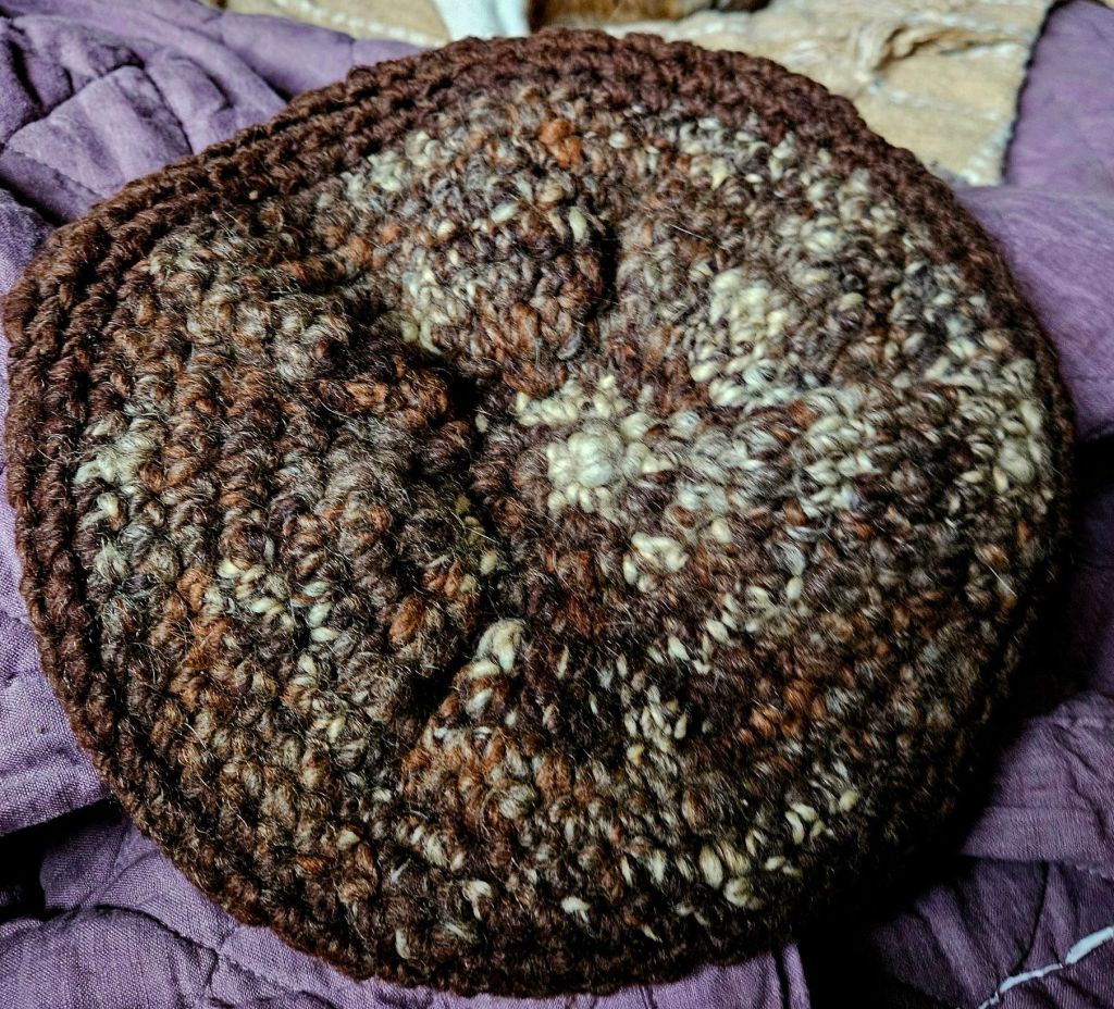 Actually, Jack reminded me that it was the famous Paula Simmons who knit this hat. She was one of the first PNW (Pacific Northwest) artists to raise and shear her own sheep. She processed the fleece, carding, and spinning the fibers, creating the yarn to finally knit garments and accessories like this hat.
